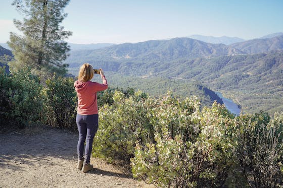 Redding’s Chamise Peak is reached via a 5-mile hike that rewards with a 360-degree vista including the Sacramento River canyon, Shasta Dam, Shasta Lake, and Mount Shasta.