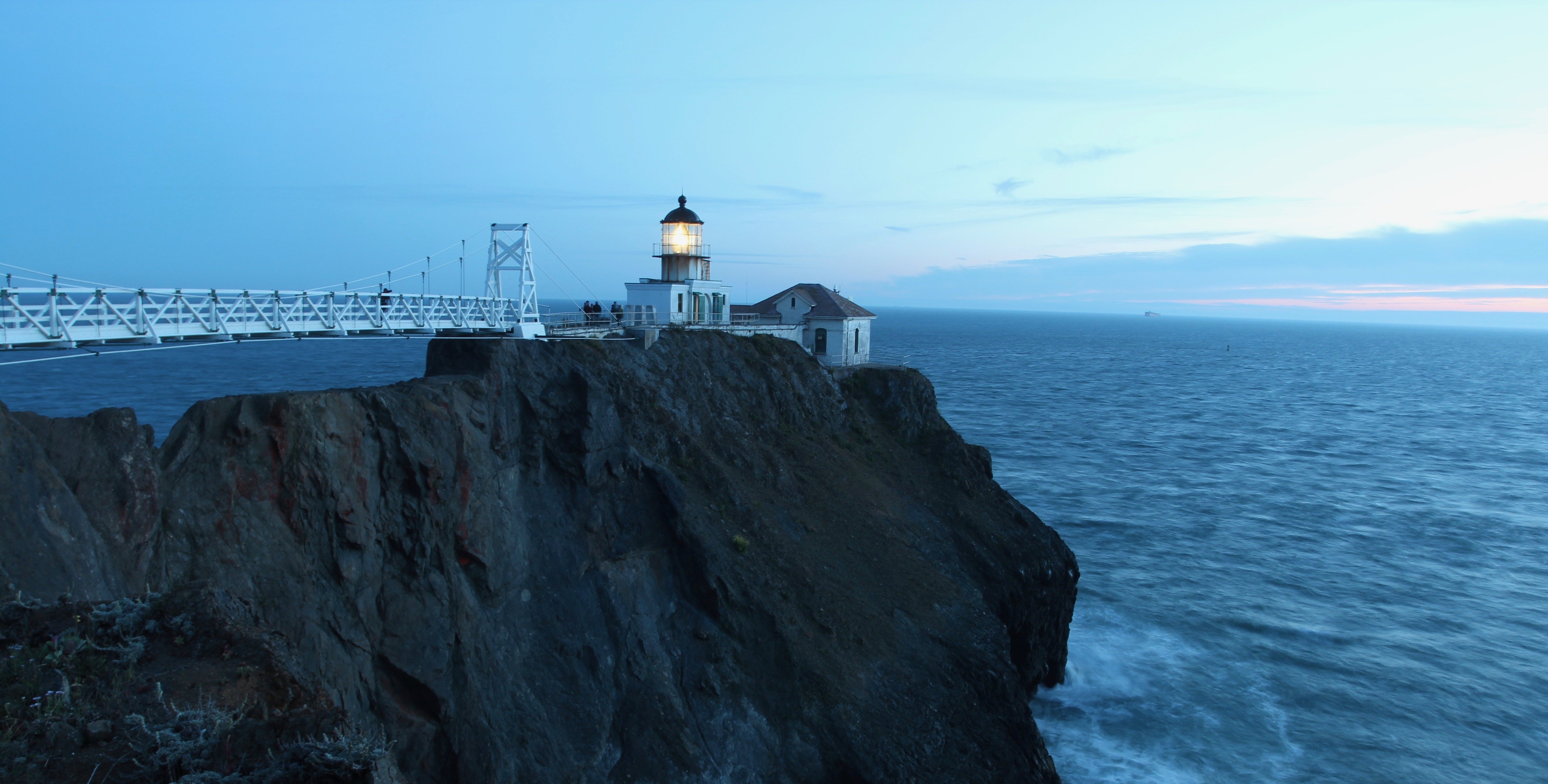 Perched on a remote promontory 124 feet above the ocean, with its dramatic setting and expansive views, Point Bonita Lighthouse lures day-visitors throughout the year. But on full-moon nights, ranger-led tours reveal an even more dramatic place. Waves crash below and the city shi