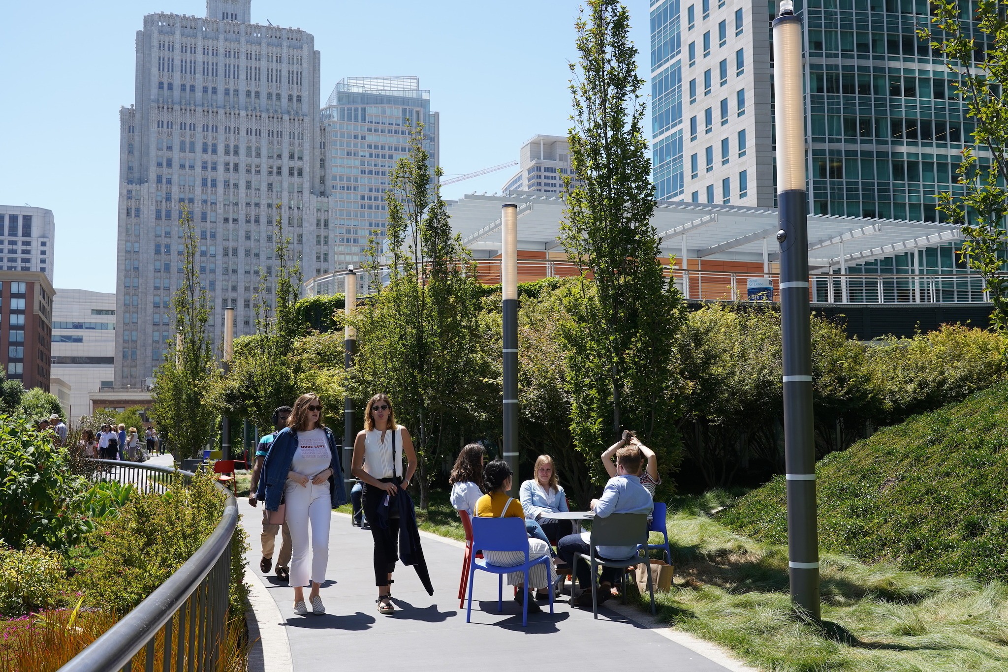 Finally, “pardon our dust” has turned into “enjoy our park!” San Francisco’s Salesforce Park in SOMA is a beautiful urban escape surrounded by skyscrapers. What do you wanna do? Because this four blocks of wonderment has some really cool stuff! You can lounge at a café table or h