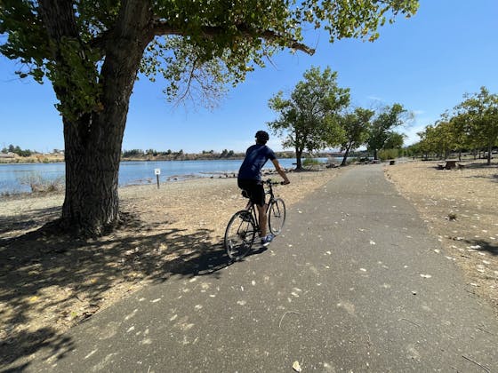 View![Person riding bike on wide dirt trail next to a lake at Calero County Park]()