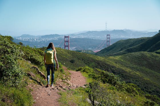 View![Bikers and walkers on the Bay Area Ridge Trail with the Golden Gate Bridge behind them]()