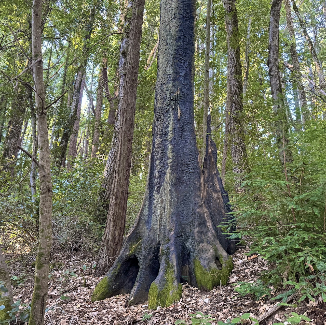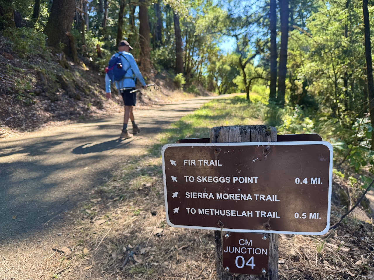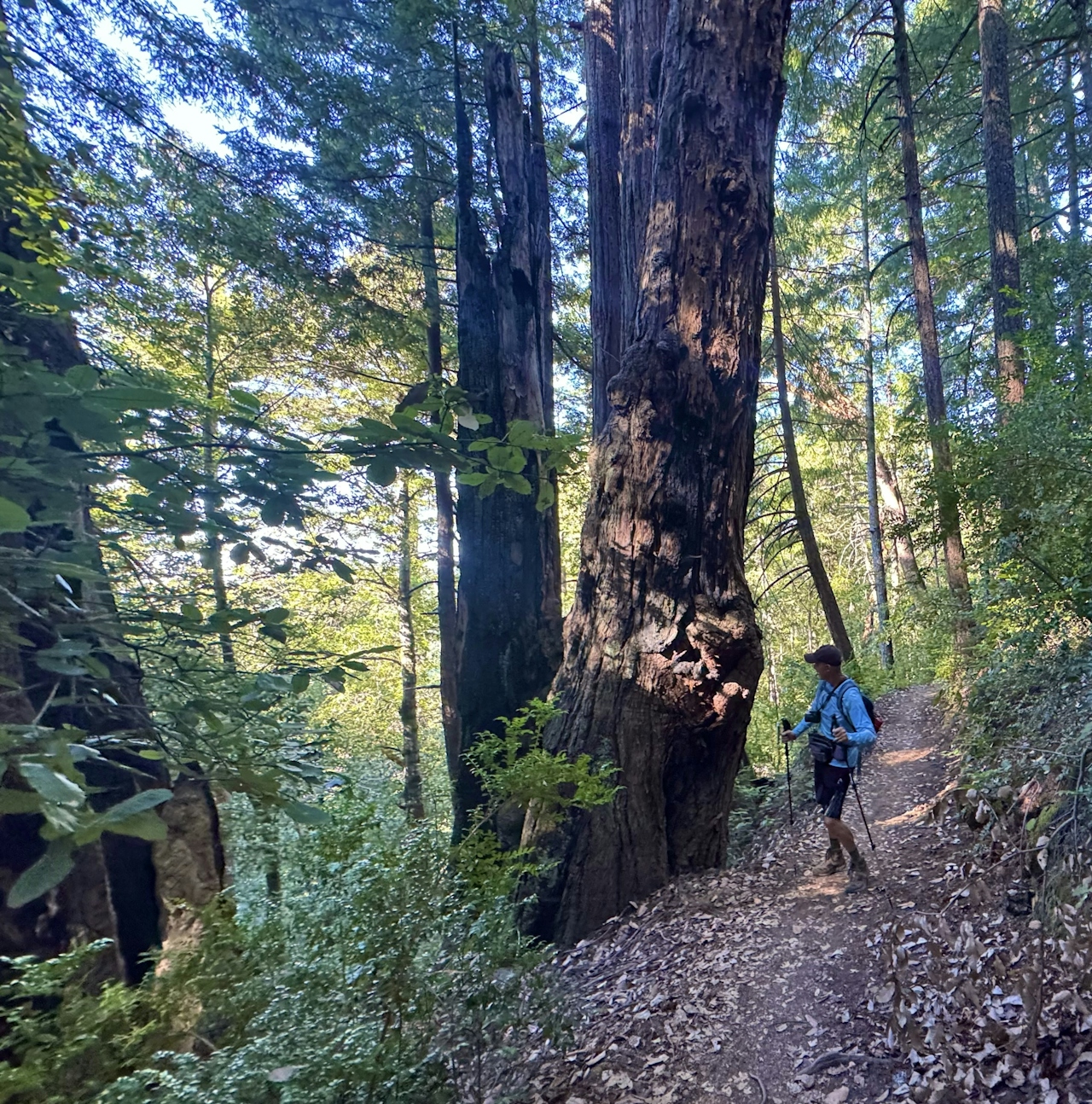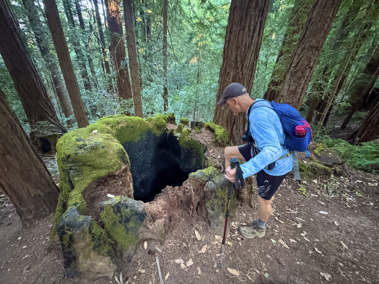 From the Skeggs Point parking lot, cross Skyline Boulevard and walk north along the road for 0.1 mile to reach the trailhead. Follow signs for Tafoni Trail as they lead into the shady forest. Several wildfires have left their mark on the landscape, and many of the massive redwood trees have scars of charred bark.